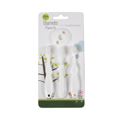 Med detta tandborstset från Barnets Favorit blir tandborstning och introduktion till den en trevlig upplevelse för både barn och föräldrar. Tandborstsetet innehåller 3 olika tandborstar för olika åldrar samt en smart sköld för att minimera spilld tandkräm på händer och kläder.