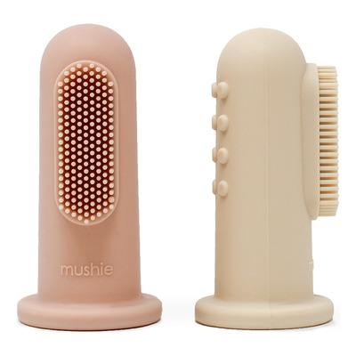 Mushie Finger Tandborste Blush/Shifting Sand är ett 2-pack smarta fingertandborstar för ditt barns ömma tandkött