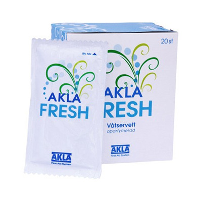 Aklafresh Våtservett har en kylande och uppfriskande effekt på huden och rengör utan att torka ut. Förpackning à 20 individuellt packeterade servetter. Servetterna är dessutom parfymfria. 100% Viscos, 17x22 cm.