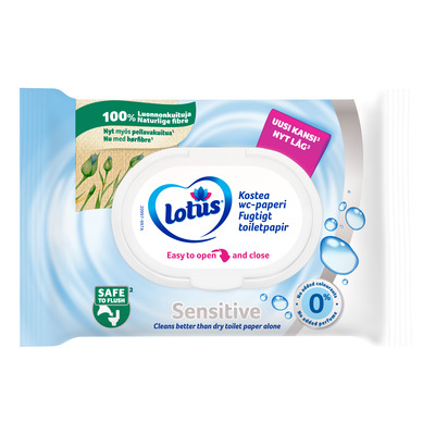 Lotus Fuktigt Toalettpapper Sensitive är ett mjukt fuktigt toalettpapper för daglig hygien utan tillsatt parfym