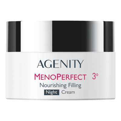 AGENITY MENOPERFECT 3° Night Cream är en närande, plumpande och intensivt regenererande nattkräm för hud i klimakteriet. Den kompenserar för hormonell förlust av fasthet och fyllighet, stärker hudens struktur och minskar rynkor med sheasmör, squalane och kakaosmör.