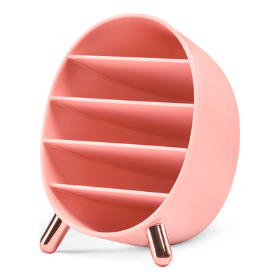 Gillian Jones Makeup Organizer Rund i rosa är en praktisk och platsbesparande lösning för förvaring av dina sminkfavoriter. Den runda formen i kombination med fem horisontella fack ger en bra överblick och enkel åtkomst till produkter som borstar, läppstift och ögonskuggor. Organizerns lutande design och stabila ben gör den både funktionell och dekorativ.