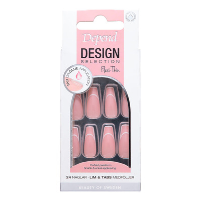 Depend Cosmetic Design Selection Artsy Smiles Coffin är lösnaglar med en modern franskinspirerad design. Naglarna har en coffin form för en elegant och välvårdad look. Den grafiska smile-designen skapar en snygg look som passar både till vardag och fest. Flexi-Thin-tekniken ger en tunn och flexibel passform som följer din naturliga nagel.