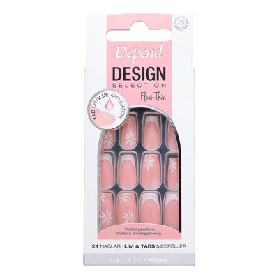 Depend Cosmetic Design Selection French Flower Blossom Short Coffin är konstgjorda naglar med en kort kistform och franskinspirerad design. Naglarna har en ljus bas med vita blomdetaljer för en välvårdad och feminin look. Flexi-Thin-tekniken säkerställer en tunn och flexibel passform som följer den naturliga nageln. Setet innehåller 24 naglar i olika storlekar så att du enkelt kan hitta rätt passform.