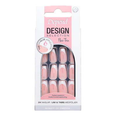 Depend Cosmetic Design Selection French White Chrome Short Coffin är lösnaglar med fransk design och kromad finish. Naglarna har en kort coffin form för en modern och välvårdad look. Flexi-Thin-tekniken ger en tunn och flexibel passform som anpassar sig till den naturliga nageln. Setet innehåller 24 naglar i olika storlekar så att du enkelt kan hitta rätt passform.