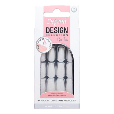 Depend Cosmetic Design Selection Pearl Lines Short Coffin är konstgjorda naglar med kort kistform och pärlemorskimrande utseende. Den ljusa designen med diskreta linjer ger ett rent och välvårdat utseende. Naglarna är tillverkade med Flexi-Thin-teknik, som ger en tunn och flexibel passform. Det gör dem bekväma att bära och lätta att anpassa till den naturliga nageln. Setet innehåller 24 naglar i olika storlekar.
