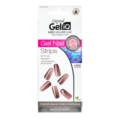 Depend Gel iQ Nail Strips Plum Goldline är färdiga nagelremsor belagda med UV-reaktiv gel. De härdar i en UV/LED-lampa på 60 sekunder och skapar en jämn, glansig yta med professionellt resultat. Varje remsa har ett integrerat bas- och toppskikt, vilket gör ytterligare lackering onödig. Materialet är flexibelt, tunt och lätt att forma efter den naturliga nageln.