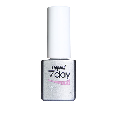 Depend 7day Hybrid Top Coat förseglar ditt 7day nagellack och ger extra glans och hållbarhet. Denna topplack är gjord av en hybridformulering som håller upp till en vecka på naglarna. 7day lack-systemet passar dig som vill ha extra glans på dina naglar och en superbra hållbarhet. Depends 7day nagellack är lätt att applicera och lätt att ta bort med en nagellackborttagare. 7day lacksystemet härdar i normalt dagsljus/lampljus och kräver ingen UV/LED-lampa.