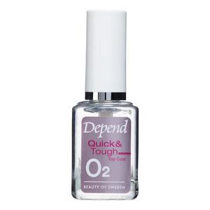 Depend Quick & Tough Top Coat ger en stark och flexibel yta som förlänger hållbarheten på ditt nagellack. Formulan torkar snabbt och ger en superglansig finish. Detta överlack minskar risken för flagning och skyddar mot dagligt slitage. Topcoaten innehåller också UV-skydd för att minska missfärgning från solljus. Det är lätt att applicera och passar alla typer av nagellack. Depend Quick & Tough Top Coat appliceras i två tunna lager ovanpå torrt nagellack.