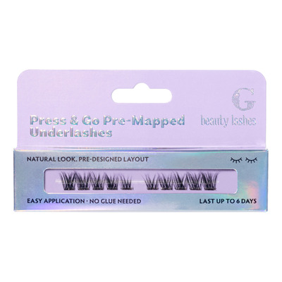 G Beauty Press & Go Pre-Designed Underlashes är självhäftande fransar som är förformade i noga utvalda längder från inner till ytter. Fransarna placeras under dina egna fransar och aktiveras av värmen och fukten i din hud. De fäster lätt utan användning av lim. Resultatet är en långvarig, naturlig look som håller i upp till 6 dagar och som kräver minimal ansträngning.