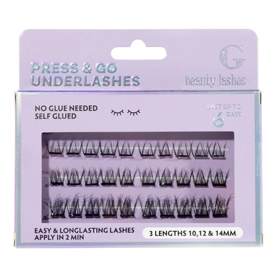 G Beauty Press & Go Underlashes är självhäftande underfransar som ger dig en elegant och naturlig look i upp till 6 dagar utan att du behöver använda lim. Fransarna appliceras under dina egna fransar och aktiveras av värmen och fukten i din hud. De fäster lätt utan lim och är idealiska för dig som vill ha en snygg look med minimal ansträngning.