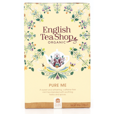 Pure Me från English Tea Shop är en smakrik, ekologisk teblandning baserad på effektiva örter som pepparmynta, bockhornsklöver, fänkålsfrön och fläder. Pepparmynta bidrar till en normal matsmältning. Teet är naturligt koffeinfritt och kan därför lätt avnjutas innan läggdags, om du känner för det. Denna variant kommer individuellt förpackade i 20 påsar, som också är handpackade i en komposterbar kartong.