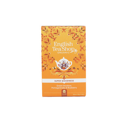 Green Rooibos Pomegranate från English Tea Shop är en härlig, ekologisk teblandning bland annat baserad på grön rooibos, hibiscus, passionsblomma, blåbär och granatäpple. Ett härligt, sött och fruktigt te som passar för hela dagen. Teet kommer individuellt förpackat i 20 tepåsar i en komposterbar förpackning.