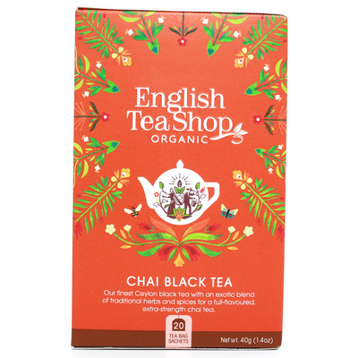 Chai Black Tea från English Tea Shop är den läckraste teblandning med kryddiga inslag av ekologiska ingredienser. Den innehåller, som namnet antyder, svart te och en intensiv chaiblandning av kardemumma, muskot, svartpeppar, gurkmeja, kryddnejlika, kanel och inte minst ingefära. Teet görs i Fairtrade-produktion och förpackningen, inklusive påsarna, är gjorda av hållbara och komposterbara material.