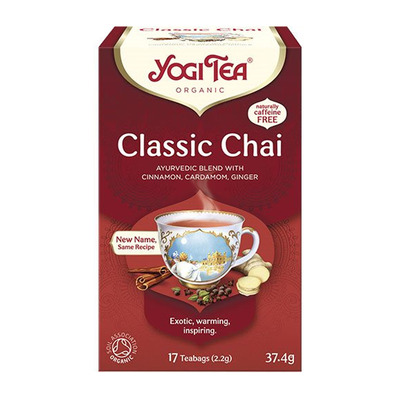 Yogi Tea Classic Chai är det te som Yogi Bhajan ursprungligen serverade till sina yogastudenter. Denna unika blandning är en kombination av traditionella ayurvediska kryddor. Kanel, kardemumma, ingefära och kryddnejlika skapar ett hjärtvärmande, avslappnande, utsökt och kryddigt te.