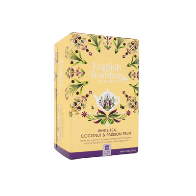 White Tea Coconut & Passion Fruit från English Tea Shop är en frisk, ekologisk teblandning med bl.a. citrongräs, ingefära och kokos. Detta te är baserat på vitt te och har en fin, aromatisk smak. Innehåller 20 tepåsar i komposterbar förpackning.