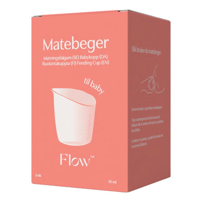 Flow Drinking Cup är en funktionell mugg avsedd för kortvarig matning av spädbarn med små mängder bröstmjölk, kosttillskott eller medicin. Muggen har en bred hällpip som passar barnets mun och en tydlig mätskala från ml till 35 ml. På baksidan finns en extra skala som gör det lätt att läsa av mängden när den lutas. Detta ger god kontroll över intaget.