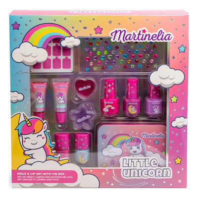Martinelia Little Unicorn Nail & Lip Set With Tin Box är en färgglad presentförpackning med smink- och nagelprodukter