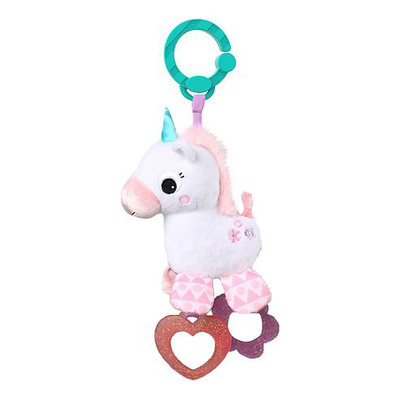 Gullig Bright Starts hängleksak är en söt, vit enhörning med rosa detaljer. Hängleksaken har en turkos plastring så att den kan hängas på babygymmet, barnvagnen eller liknande. Enhörningen har 2 gummiringar som hänger på magen, som kan lindra ömt och kliande tandkött, samt rassla när den rör sig. Tillverkad av polyester + plast.