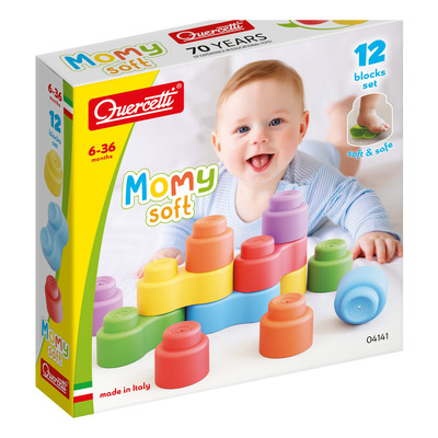 Quercetti Momy Soft är ett set med 12 mjuka klossar som är säkra och färgglada för att bygga med barn