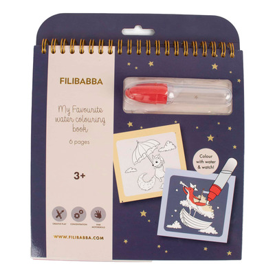 Filibabba Vattenmålarbok - Dreamy Adventurers innehåller illustrationer med välkända motiv, där djur, ballonger och stjärnor fyller sidorna. När sidorna torkat kan de färgläggas om och om igen.