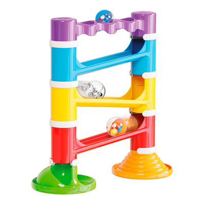 Bygg tornet, placera en boll högst upp och tryck lätt på den med handen. Se och hör hur den rullar hela vägen ner.