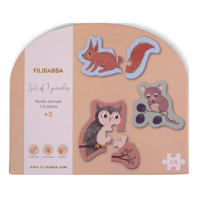Filibabba Set med 7 pussel - nordiska djur utvecklar inlärningsförmågan och testar koncentrationen hos barn från 3 år och uppåt