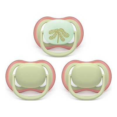 Philips Avent Napp Ultra Air Dag och Natt 6-18 mån, turkos och grön är ett set med tre nappar med självlysande funktion