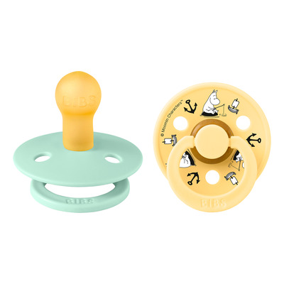 BIBS x Moomin Colour Latex är ett 2-pack med nappar präglade med söta muminfigurer och ett seglingstema