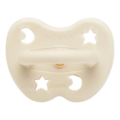 Förpackning med vit originalnapp från Hevea i välkänd, ortodontisk design