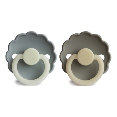 FRIGG Daisy Rund Silikon French Grey Night/Portobello Night är ett 2-pack nappar med glow-in-the-dark-funktion