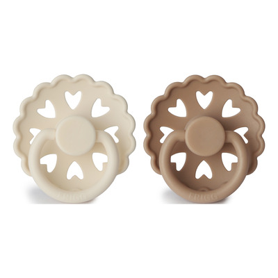 Detta 2-pack med nappar från FRIGG är en del av Fairytale-kollektionen, som är inspirerad av H.C. Andersens fantastiska sagor. Napparna är med sina fina kanter inspirerade av H.C. Andersens magiska pappersklipp samtidigt som de 8 små hjärtanen i skölden symboliserar kärlek och omsorg. FRIGGS Fairytale-nappar med sin runda bröstvårfform, ligger bra i munnen på barnet, eftersom den liknar mors bröst både i form och material. Denna form av napp rekommenderas av pediatriska experter i Danmark.