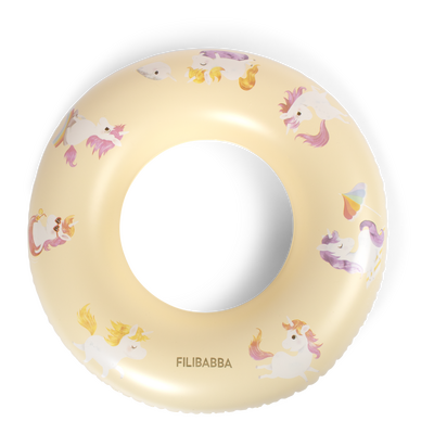 Badringen är utsmyckad med det färgglada Unicorn Shores-trycket och är testad och godkänd enligt EN-7. Lämplig för barn 1-6 år (11-30 kg).