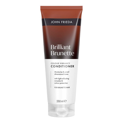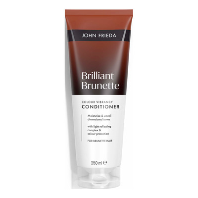 John Frieda Brilliant Brunette Colour Protecting Conditioner skyddar och ger näring åt färgat brunt hår. Balsamet är speciellt framtaget för att bevara de bruna nyanserna och förhindra att färgen bleknar. Det återfuktar håret på djupet och lämnar det glänsande och friskt. Balsamet är lämpligt för alla typer av brunt hår och stärker håret så att det känns mjukt och lätt att reda ut efter varje tvätt. Produkten är idealisk för färgbehandlat hår som behöver extra skydd och vård.