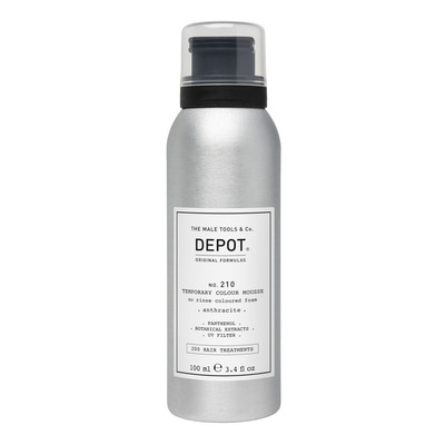 Depot 210 Temporary Colour Mousse är speciellt utvecklad för män med vitt eller grått hår. Moussfärgen ger en snabb och tillfällig färg till vitt eller grått hår med antracitpigment och tillför fukt och vård till håret. Det ger en balanserad hårfärg i form av en naturlig askreflektion som motverkar gula och varma toner i håret.