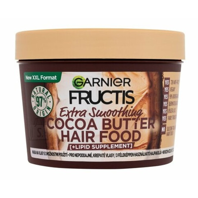 Fructis Hair Food Cocoa Butter Mask från Garnier är en fantastisk och super väldoftande 3-i-1 hårmask för torrt och lockigt hår som saknar styrka och näring. Formulan består av 97% naturliga ingredienser, såsom vegetabilisk olja och är lämplig för Curly-Girl-metoden. Hårmasken kan användas som balsam för att ge näring åt håret, vilket gör det lättare att reda ut. Den kan även användas som hårmask. Låt den sitta i några minuter innan du sköljer ur den igen - på så sätt kommer den att tillföra extra näring till håret. Slutligen kan du använda hårmasken till leave-in kräm i topparna, vilket ger håret extra glans och gör att det känns silkeslent.