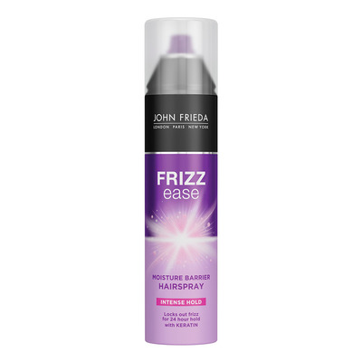 John Frieda Frizz Ease Moisture Barrier Intense Hold Hairspray är en hårspray berikad med keratin och avancerade polymerer som ger intensiv stadga utan att kännas tung. Den specialutvecklade formulan ger en långvarig, frissfri finish, vilket gör den idealisk för att hålla även de mest frissiga frisyrerna på plats. Hårsprayen skyddar mot luftfuktighet så att frisyren håller längre. Hårsprayen är säker att använda på färgbehandlat hår. Lämplig för alla hårtyper som behöver extra kontroll och skydd mot friss.
