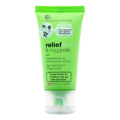 Faaborg Pharma Relief Green mot myggbett är en klådstillande och självrengörande kräm med naturens egna ingredienser. Krämen lindrar klåda, sveda och svullnad efter insektsbett, maneter och brännässlor. Relief Green innehåller Syricalm och Niacinamide, som är kända för sina lugnande och skyddande egenskaper.