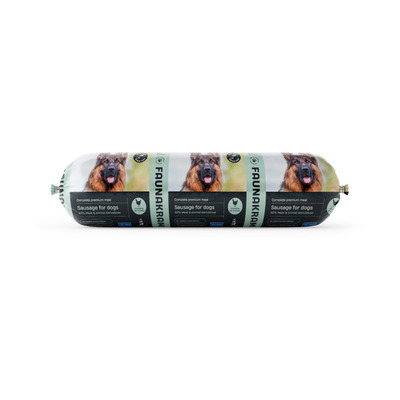 Faunakram Korv med våtfoder, kyckling (80% kött) är ett välsmakande våtfoder för alla hundraser