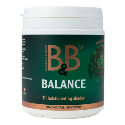 B&B Balance är ett kompletteringsfoder för hundar som innehåller tre olika typer av hydrolyserade kollagenpeptider: CPF 218, CPT 202 och CPB 227. Dessa kollagentyper förekommer naturligt i hundens kropp och finns i brosk, muskler, senor och ligament. Pulvret är smaklöst och innehåller inga tillsatser. Det kan användas som en del av den dagliga utfodringen och ges tillsammans med hundens vanliga foder.