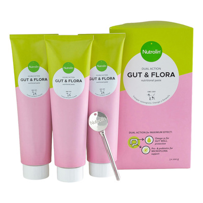 Nutrolin Gut & Flora Paste är ett kompletteringsfoder för hundar och katter som kombinerar fiskolja och krill med omega-3-fettsyror. Omega-3 kan bidra till att upprätthålla tarmväggen. Den innehåller också prebiotika som MOS, FOS och fruktan samt probiotiska bakterier som kan stödja tarmens mikroflora. Pastan har en mild smak och ges dagligen i fodret. En tub innehåller 90 portioner.