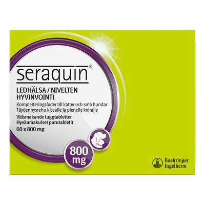 Seraquin tuggtabletter är ett kosttillskott för hundar och katter som stödjer normal ledfunktion. Produkten innehåller glukosamin och kondroitinsulfat, som är naturliga byggstenar i broskbildningen. Dessa näringsämnen bidrar till att bibehålla friska leder, ledkapslar, senor och ligament. Dessutom innehåller tabletterna gurkmejaextrakt, som fungerar som en kraftfull antioxidant. Gurkmeja bidrar till att neutralisera fria radikaler som kan påverka ledfunktionen.