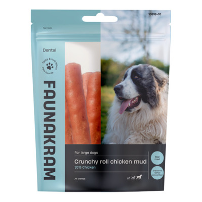 Faunakram Dental Crispy Chicken Roll är ett välsmakande och lättuggat snack för stora hundar. Rullarna har en utsökt kycklingsmak som tilltalar även de mest kräsna hundar, samtidigt som de bidrar till bättre munhälsa. Den krispiga konsistensen bidrar till att minska plack och tandsten, vilket ger din hund friskare tänder och tandkött.