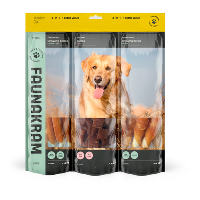 Faunakram hundsnacks 3i1 med anka & kyckling är ett paket med varierat godis för alla hundar
