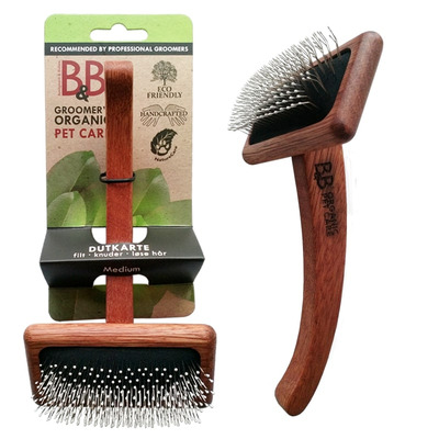 Kardan från B&B är skonsam med vinklade piggar och skyddande piggar, som är idealiskt för att reda ut tovor, knutar, löshår och håravfall. Borsten säkerställer en grundlig borstning och är utrustad med ett ergonomiskt korrekt handtag som säkerställer ett bra grepp så att du behåller kontrollen över kardan. Kardan är av hållbart tamanuträ.