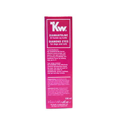 Diamantögon från KW tar effektivt bort missfärgningar från både hundar och katters ögon. Missfärgningar uppstår lätt vid ögon som rinner mycket. Missfärgningar är ofta särskilt tydliga hos vita och ljusa hundar. Diamantögon kan också användas för att rengöra hudveck på hundar med många rynkor och veck som: Blodhund, Boxer, Bulldog, Mastiff, Pekingneser och Shar Pei och andra.