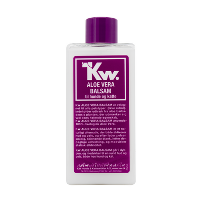 KW Aloe Vera Balsam för hundar och katter passar alla typer av päls, förutom hundar med strävt hår. Balsamet innehåller extrakt från växten aloe barbadensis, som är känd för sina läkande egenskaper. Det hjälper till att lösgöra och lösa upp döda celler samt att bygga upp nya. Balsamet rengör på djupet och gör att pälsen känns ren och glänsande.