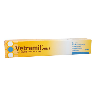 Dessa örondroppar för djur från Vetramil är en naturlig behandling för öronproblem. Örondropparna är effektiva mot hörselgångsinflammation, eksem, klåda och irritation i hörselgången. Örondropparna är baserade på medicinsk honung, som har tillsatts eteriska oljor. Honungen har ett högt enzyminnehåll, vilket ger en unik antibakteriell effekt och säkerställer en snabb sårläkning. Dropparna har en antiinflammatorisk effekt, vilket minskar rodnad, svullnad och ger örat lugn. De eteriska oljorna ger en bitter smak, vilket minskar djurets lust att slicka i det.