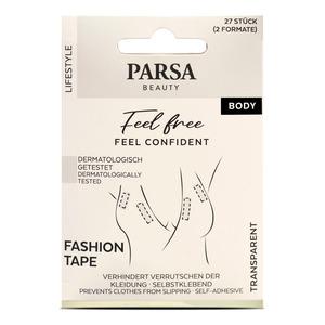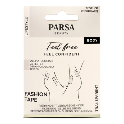 Parsa Beauty Fashion Tape finns i två olika format, så att du kan välja den typ som passar bäst till din outfit. De 27 remsorna i förpackningen gör det möjligt att använda tejpen flera gånger. Perfekt för halsringningar, skjortor och axelbandslösa modeller.
