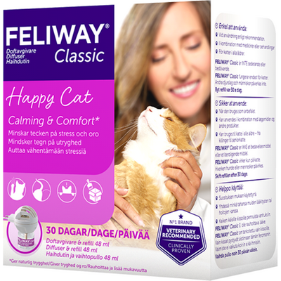 Denna Feliway Classic Diffusor & refill hjälper till att skapa ökad trygghet i hemmet för katter, så att de lättare kan finna lugn och koppla av. När katten känner sig trygg i sin vana omgivning, visar den det genom att gnugga sig mot olika saker för att utlösa doftsignaler. Katten släpper ut en feromon, som överförs och hjälper till att signalera att det är ett säkert ställe att vara på. När det sker förändringar i kattens miljö kan katten bli stressad och rastlös och i sådana situationer kan du använda Feliway Classic Diffusor + refill för att skapa ökad trygghet.